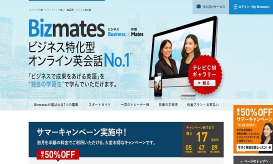 ビズメイツは、オンライン英会話業界で唯一のビジネス特化型のオンライン英会話スクールです。ビジネスで成果を上げる為の英語学習にこだわり、単に「ビジネス英会話」を学ぶだけでなく、「効果的なコミュニケーションスキル」、「異なる文化や価値観を受け入れるマインド(ダイバーシティ)」、「周囲を巻き込んで進める力(リーダーシップ)」、「信頼関係を築くための人間性」といった素養を総合的に高め、受講生が実際のビジネスで成果をあげられるよう設計されたオリジナル教材を用いて学習する事が可能となっています。