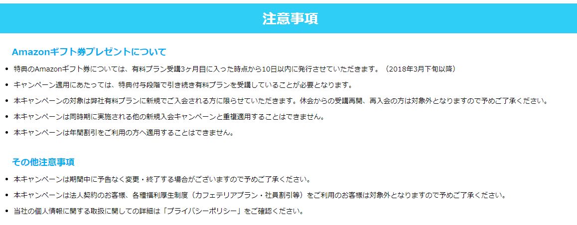 獲得条件としては、期間中に有料会員プランに入会し、受講3ヶ月目に入った時点で配布されるキャンペーンとなりますので、継続的にレッスンを受講されている方向けのご褒美的な内容となっています。
